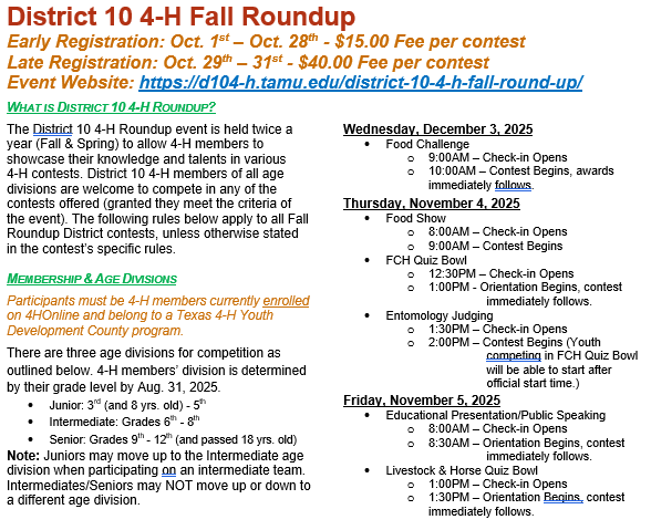 We are pleased to release the 2025-26 guidelines. As you will see from the guidelines, there have been a few changes made with the most notable indicated below. Please remember, these changes are for the Texas 4-H Roundup state contest. County and district contest rules can and may vary so please check those guidelines related to those specific contests.
