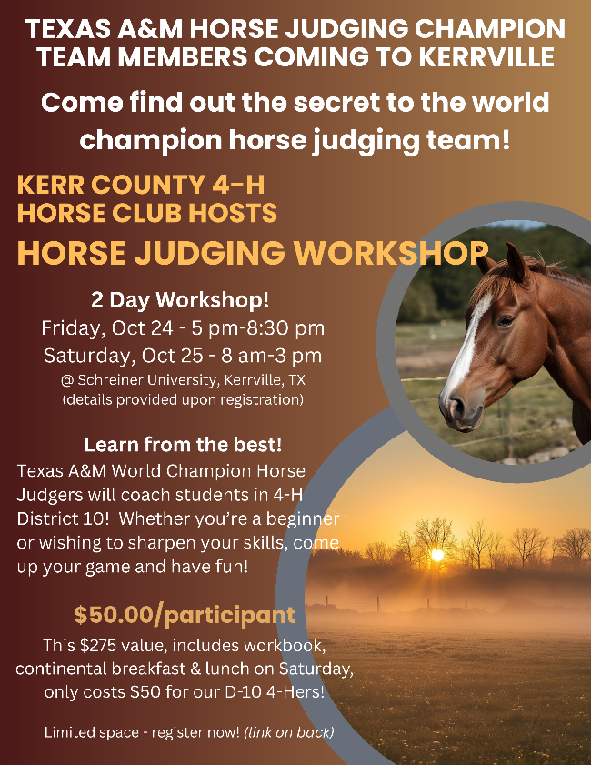 The Guadalupe County 4-H Livestock Judging Contest will be held on a new date this year – FRIDAY, October 24. It will be held in Marion at the Country Church Arena. Details are on the attached flyer.