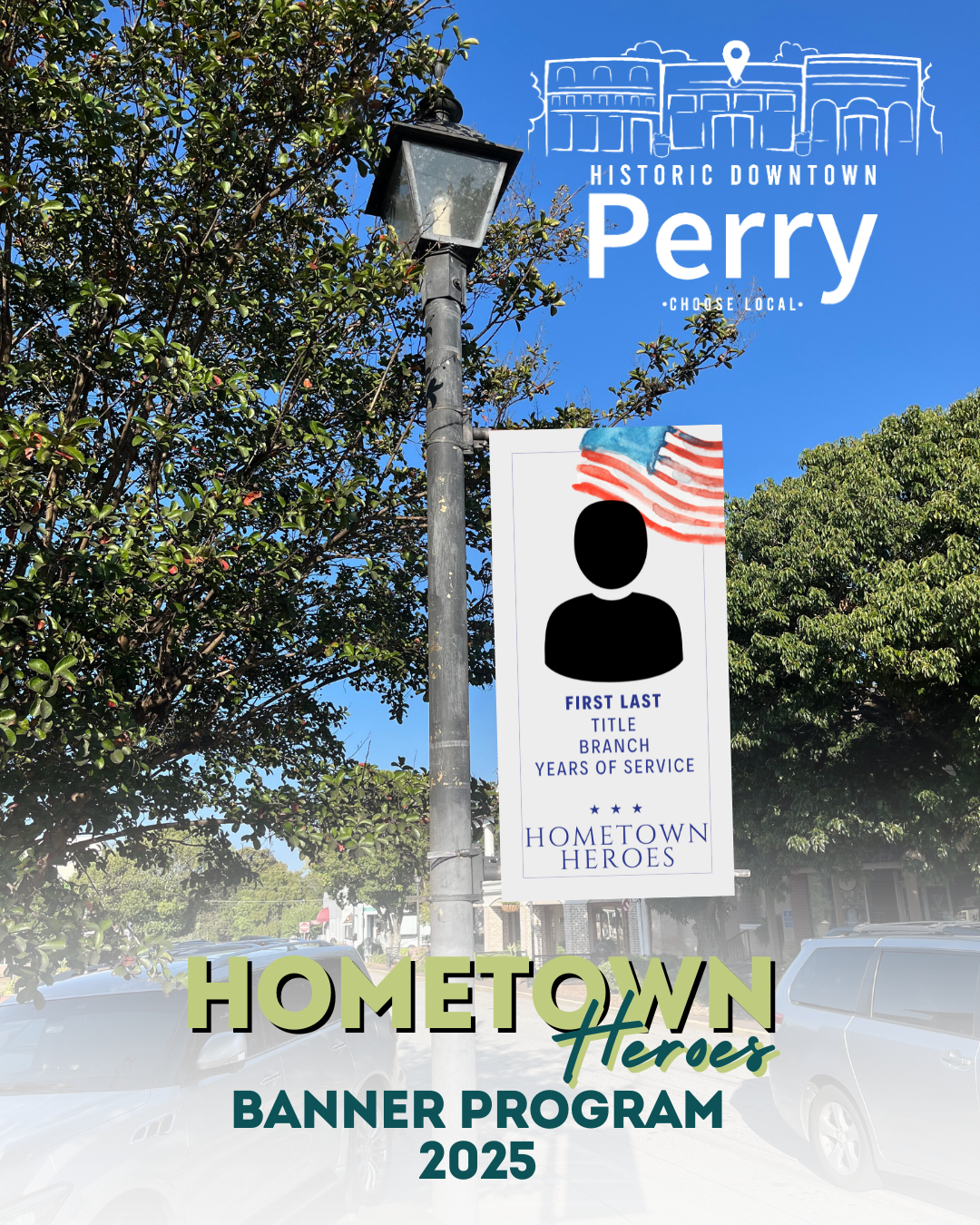 Honor a veteran in your life with a personalized banner in Downtown Perry this November. Each double-sided banner will feature their name, photo, branch of military, years of service, and rank — proudly displayed on one of only 14 available banner poles.
