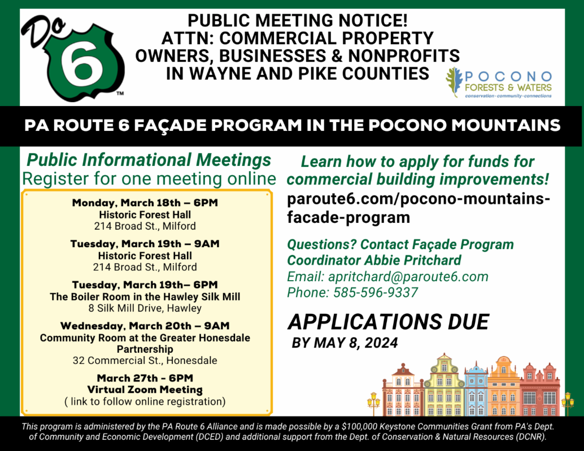 We are excited to bring the PA Route 6 Facade Program to the Pocono Mountains Region. Wayne and Pike County commercial building owners and businesses/nonprofits (with property owner approval) will be able to apply for up to $5,000 each toward upgrades and improvements of their building’s façade (front exterior visible from the road). Recipients will be required to invest 1:1 matching funds into the project. Commercial buildings may be located anywhere in Wayne or Pike counties, and eligible improvements include but are not limited to exterior paint, new signage, windows, and canvas awning replacement.