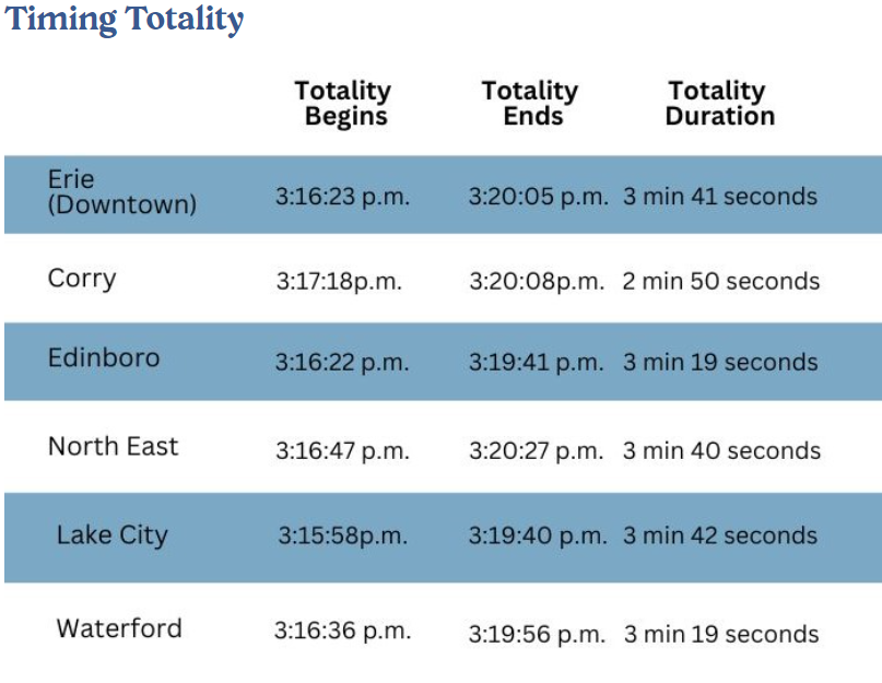 The VisitErie website is truly a fantastic resource for anyone hoping to experience the Total Solar Eclipse on April 8th. One of those resources is a chart to help visitors time the eclipse. It just so happens that a couple of the towns mentioned are Heritage Communities, such as Corry and Edinboro.