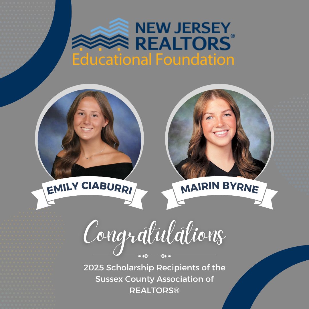 Please join us in extending a huge CONGRATULATIONS to Emily Ciaburri and Mairin Byrne, who were selected as scholarship recipients for the 2025 Sussex County Association of REALTORS scholarships through the New Jersey REALTORS® Education Foundation.