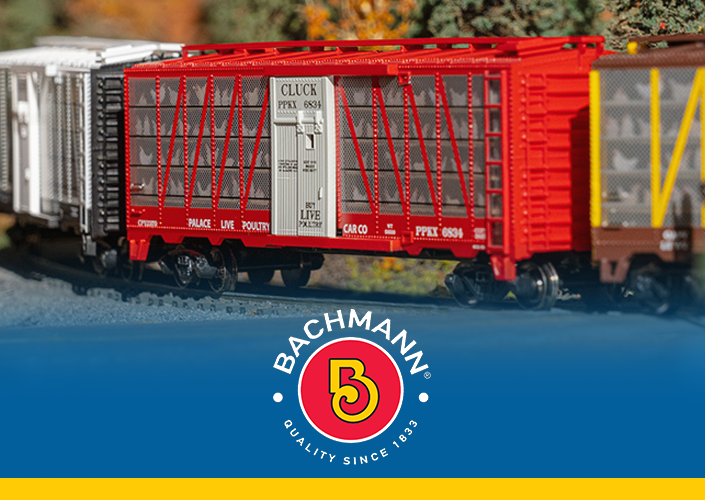 Developed in 1884 as an improved means for transporting chickens, ducks, turkey, and other fowl, Poultry Transport Cars were crucial in delivering favorites to the dinner table through the 1950s. These “henhouses on wheels” were designed specifically for the protection and comfort of the animals being transported, and featured wire mesh sides with multiple levels of individual coups, each fitted with feed and water troughs. An attendant traveled on board in the central compartment to feed and tend to the animals throughout their journey, often living in the space for up to a week as their train made its way across the country. Such was the relative comfort for the fowl being transported, that many owners opted to give names to their cars - a light-hearted nod to the luxurious named Pullman coaches of the era. Live poultry trains reached the height of their popularity in the early 20th century, and "Turkey Specials" would continue to run in the days approaching Thanksgiving and Christmas until the last examples of this unique car were withdrawn in 1956, facing competition from trucks. The Bachmann Poultry Transport Car allows you to rekindle the history surrounding these unusual rolling stock items in HO scale, coming with see-through siding featuring a printed mesh finish, inserts depicting chicken or turkey cargo, an attendant service door, and all of our quality Silver Series® components, including E-Z Mate® Mark II couplers and blackened metal wheels.