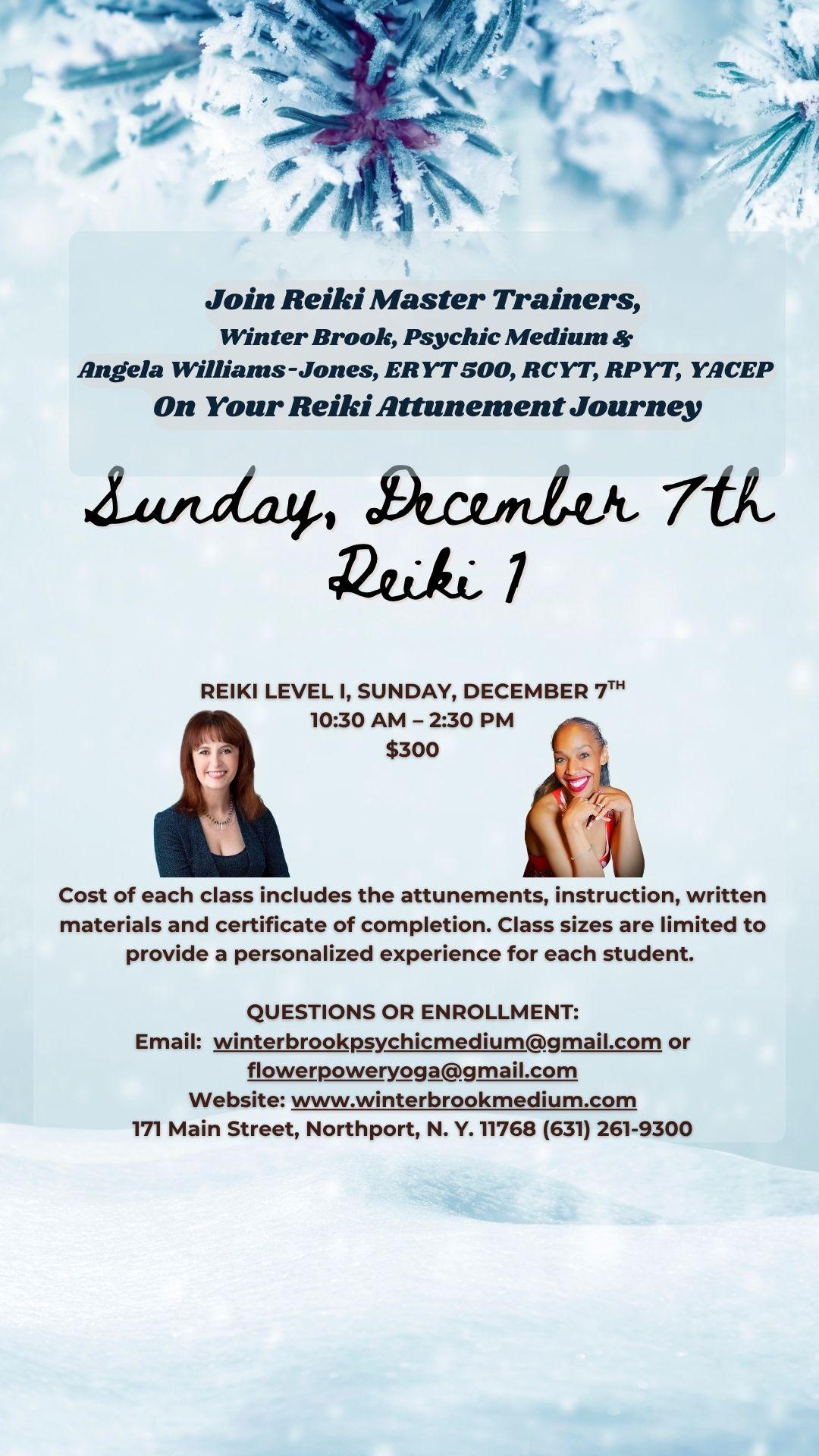Sunday, December 7, 2025 @ 10:30am - 2:30pm in person Reiki Level 1 Certification and Attunement with Angela Williams-Jones & Winter Brook, in person @ 171 Main Street, Northport, NY 11768 RSVP required, limited to 6 students to allow for personalized time for each student. Class will include 4 attunements, instruction time, manual and meditation. $300 tuition.