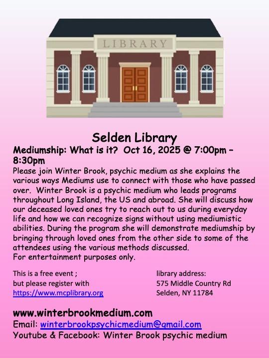 Thursday, October 16, 2025 @ Middle Country Library - Selden Branch @ 7pm, Mediumship: What is it?