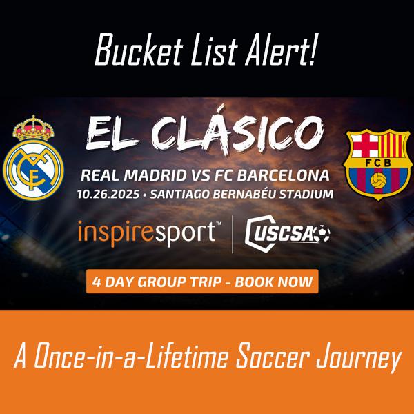 | Time’s Running Out: Be There for Real Madrid vs Barcelona! | Next month, Indiana Soccer Association is thrilled to offer an exclusive, once-in-a-lifetime opportunity to witness the world’s biggest soccer rivalry – El Clásico: Real Madrid vs Barcelona on October 26, in partnership with USCSA and their travel provider, Inspiresport. | |