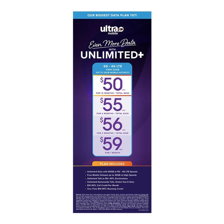 Unlimited Nationwide Talk, Global Text & Data with 60GB at 5G / 4G LTE Speeds
