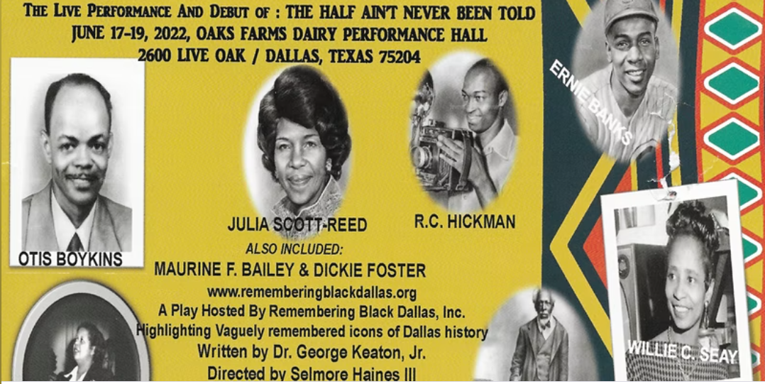 Play: "Half Ain't Never Been Told" George Keaton, Jr, Remembering Black Dallas, wrote the play to highlight the accomplishments of local pioneers who made a way out of no way. Friday, June 17th; 7:30pm; Saturday. Latino Cultural Center; 2600 Live Oak.