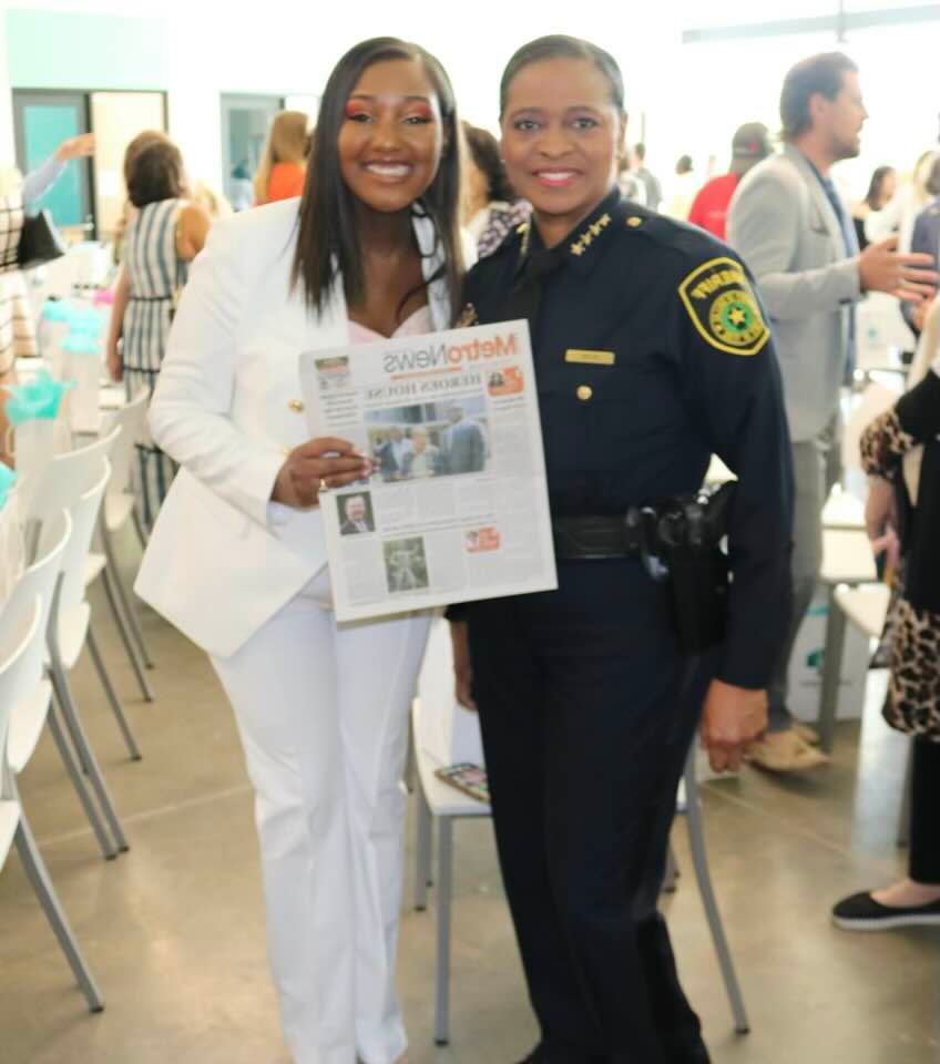 Texas Metro News’ multi-media journalist Asia Alcorn with Dallas County Sheriff Marian Brown at grand-opening of new Austin Street Center, Thursday. Residents will move in on Tuesday, June 21 at 1717 Jeffries Street. The 60,000 sq. ft. facility includes housing for the homeless, a computer lab. @texasmetronews