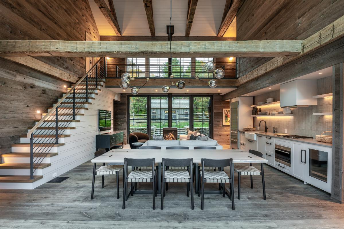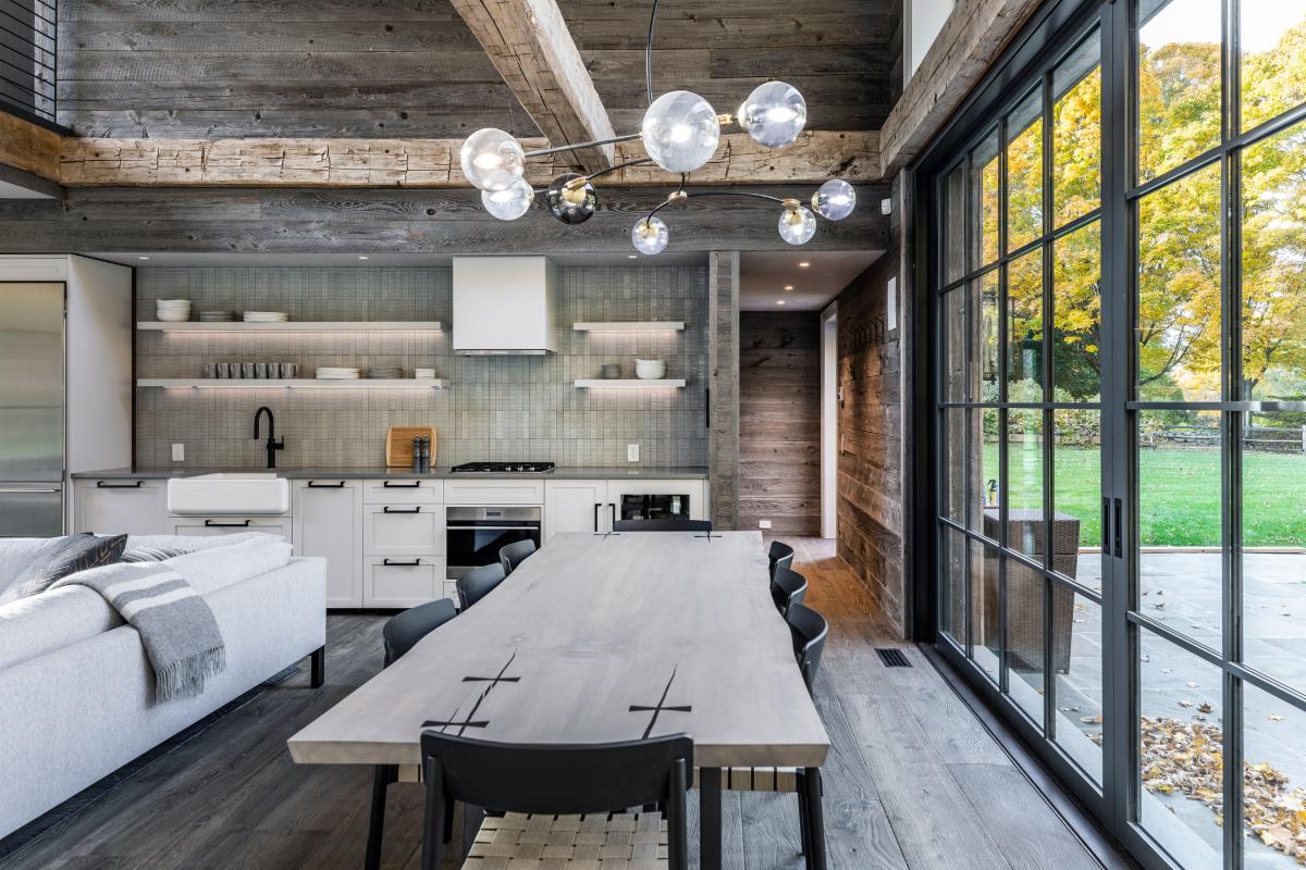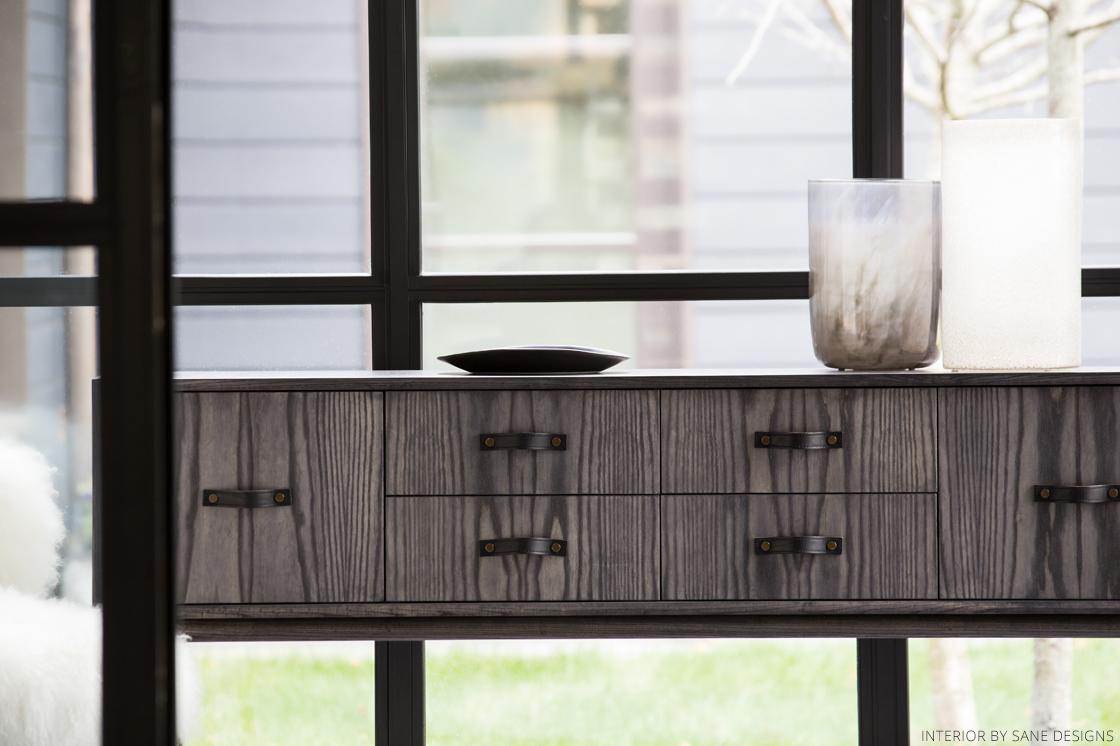 FOR THIS PROJECT, A MIX OF TEXTURAL ELEMENTS ARE INTERWOVEN TO CREATE A LUXURIOUS AND YET SUPREMELY WELCOMING SPACE. ROOM'S IVY CHANDELIER AND JASPER SECTIONAL WORK BEAUTIFULLY WITH A CUSTOM LIVE EDGE DINING TABLE, 2-TONE DINING CHAIRS AND ELEGANT STORAGE.