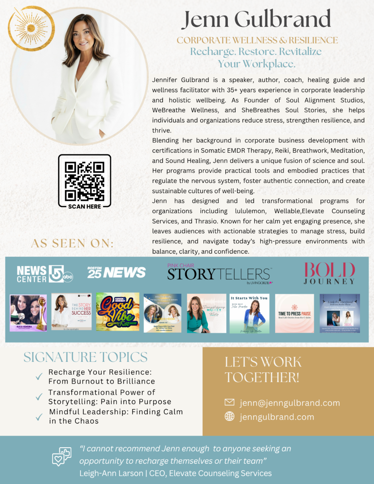 If your organization is looking to support employee well-being, improve culture, and create sustainable practices that promote clarity, balance, and emotional wellness — Jenn would love to connect.