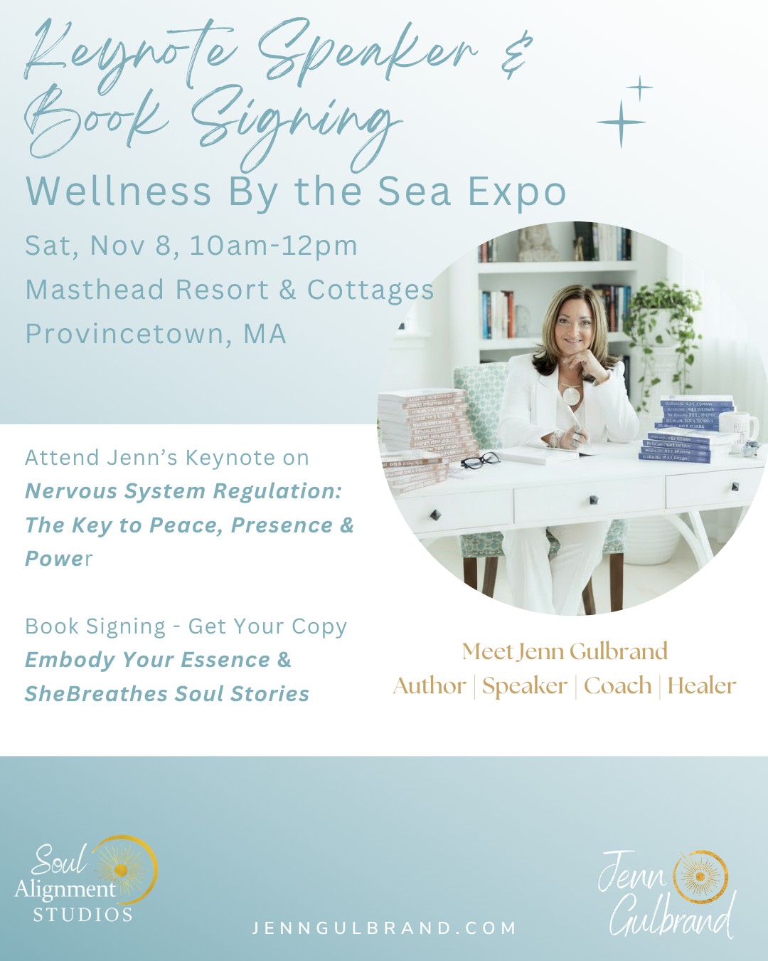 Jenn Gulbrand will be delivering the keynote talk at this year’s Provincetown Family Health & Wellness Expo.. Her interactive keynote, Regulating Your Nervous System: The Key to Peace, Presence & Power will guide you to understand how your body responds to stress — and how to shift from survival mode into safety, connection, and calm.