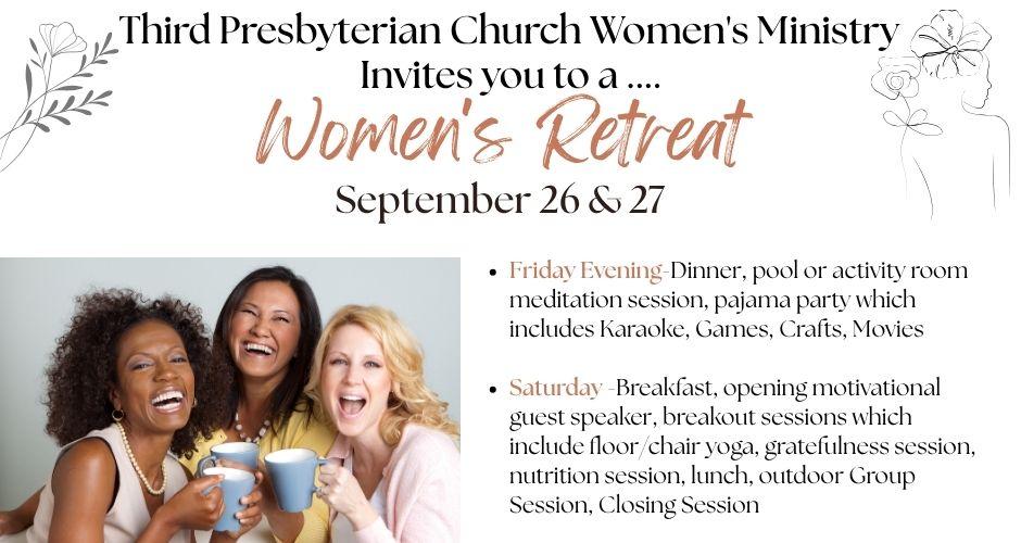 Third Presbyterian Church Women's Ministry is hosting a Women's Retreat. To register for the R3 – Refresh, Replenish and Renew Retreat, which will take place on September 26th and 27th at the Pallontine Retreat Center located in Florissant (15270 Old Halls Ferry Rd), Missouri. TPC has reserved the entire facility, which offers spacious bedrooms, meditation rooms, a beautiful chapel, a solarium, walking trails, garden areas, an exercise room, a pool, and much more. This will be a time for fun, relaxation, and socialization while learning how God wants us as women to take care of our minds, bodies, and souls. This is an opportunity to invite your friends to join you.