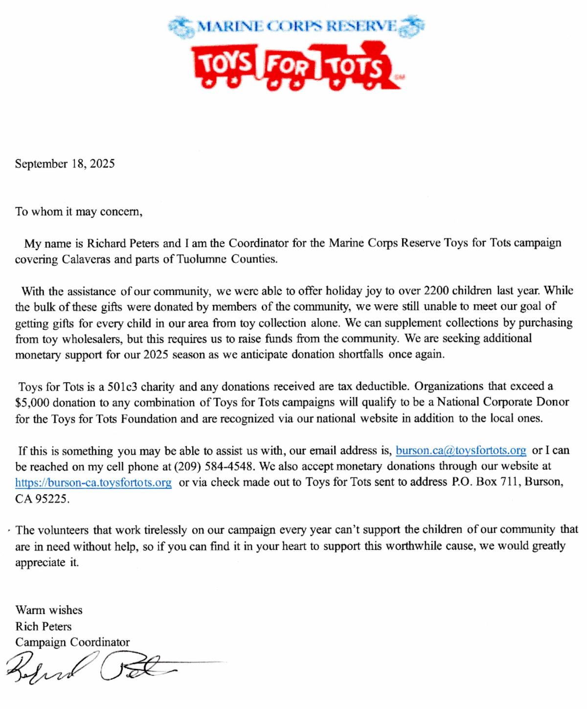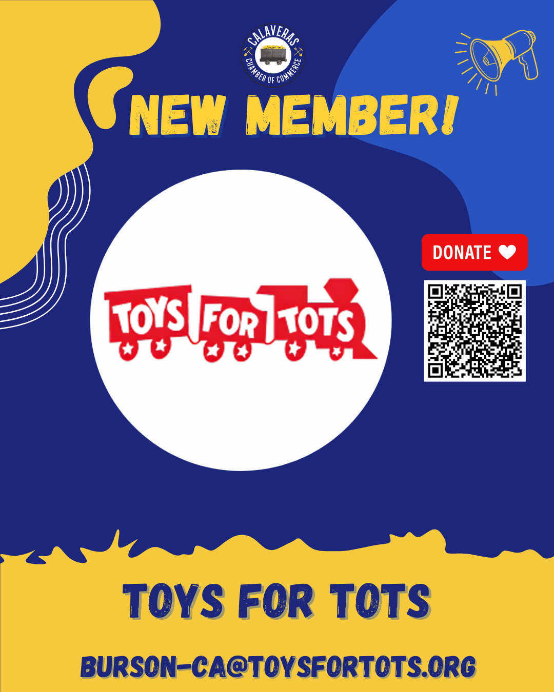 We're excited to welcome Toys for Tots as the newest member of the Calaveras Chamber of Commerce! Toys for Tots brings joy to local children each holiday season by collecting and distributing new, unwrapped toys throughout Calaveras County. Their mission helps ensure every child experiences the magic of the holidays.