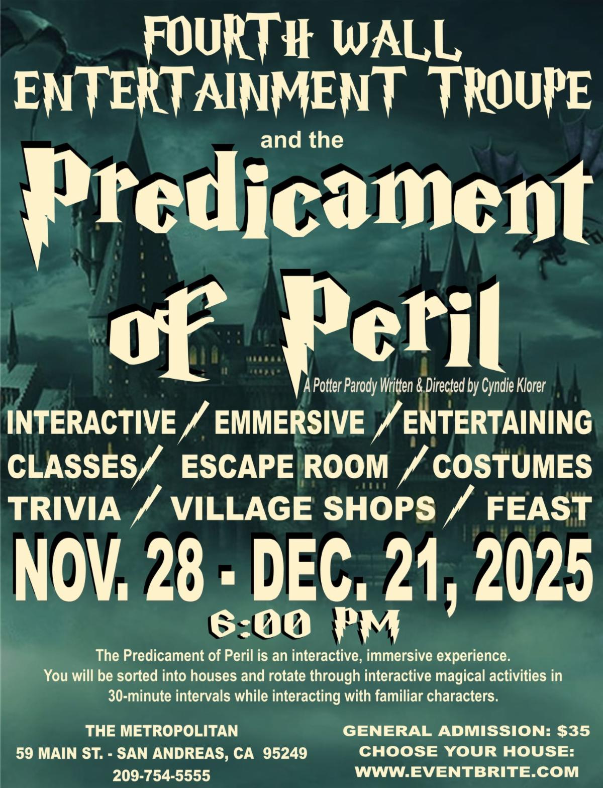 Step into a world of wonder as Fourth Wall Entertainment Troupe brings The Predicament of Peril to life. This holiday adventure transforms the Metropolitan into a spellbound realm filled with whimsical character, magical classes, mysterious challenges, and enchanting surprises around every corner.