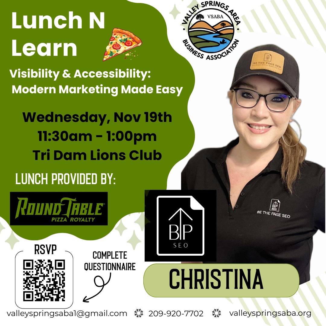 Ready to take your business visibility to the next level? Join Christina from Be the Page SEO and the VSABA for a Lunch & Learn on Wednesday, November 19th at the Tri-Dam Lions Club. Learn simple, actionable strategies to make your business stand out online - including local SEO must-haves, Google Business Profile setup, and online ADA compliance. Lunch will be provided by Round Table Pizza.