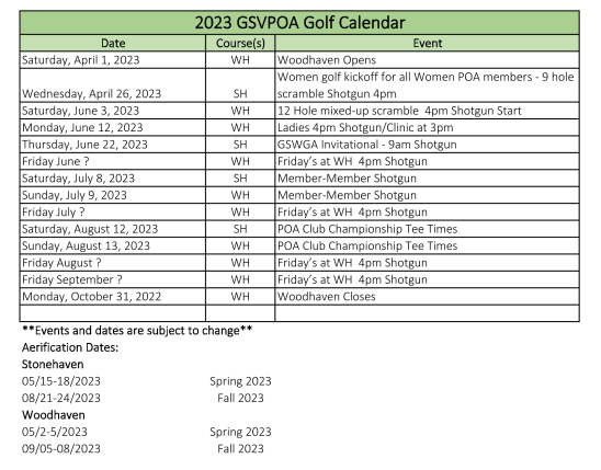 I am sure everyone is looking forward to the official start of the 2023 golf season at Stonehaven and Woodhaven. As we get into our spring weather (more available days for golf!), we have a few items we would like to remind everyone about as we start the new season. For those players who would like the opportunity to tee off on holes near their homes (instead of the #1 tee), please be sure to call the golf shop for availability and to let us know you will be on the golf course. We need this information for various reasons, including scheduled golf maintenance, safety, and the collection of rounds data to name just a few. It is important to not jump in front of other POA members or guests when not checking in and starting at #1.
