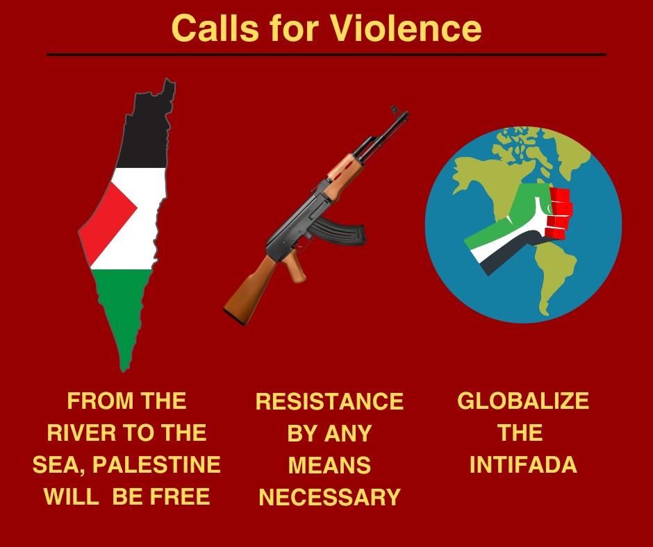 Other common anti-Israel chants invoked at rallies across America and around the world include, “From the river to the sea, Palestine will be free” – a cry for destroying the entire Jewish state. A Palestinian state from the Jordan River to the Mediterranean Sea means the elimination of the State of Israel. During Israel’s War of Independence, the head of the Muslim Brotherhood – the parent organization of Hamas – called for Arabs to “drive the Jews into the sea.” “From the river” is another iteration of this phrase – adopted by Hamas – that also can mean the ethnic cleansing of Jews from the Land of Israel.