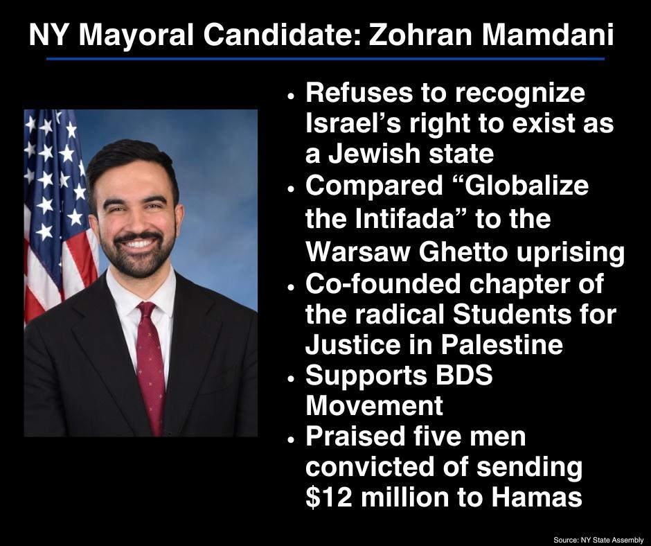 In a 2017 rap video, he referenced “My love to the Holy Land Five.” They were five men convicted by a federal jury of sending $12 million to Hamas. The charismatic politician also co-founded Bowdoin College’s Students for Justice in Palestine chapter in Maine. The national SJP organization recently threatened to kill Americans and Israelis over Iran, vowing – “The alternative to leaving vertically is leaving horizontally.” Despite his stated commitment to address antisemitism and other acts of hate in NY, Mamdani refuses to recognize Israel’s right to exist as a Jewish state, supports the Boycott, Divestment and Sanctions movement and criticized Israel just a day after the Oct. 7 massacre.