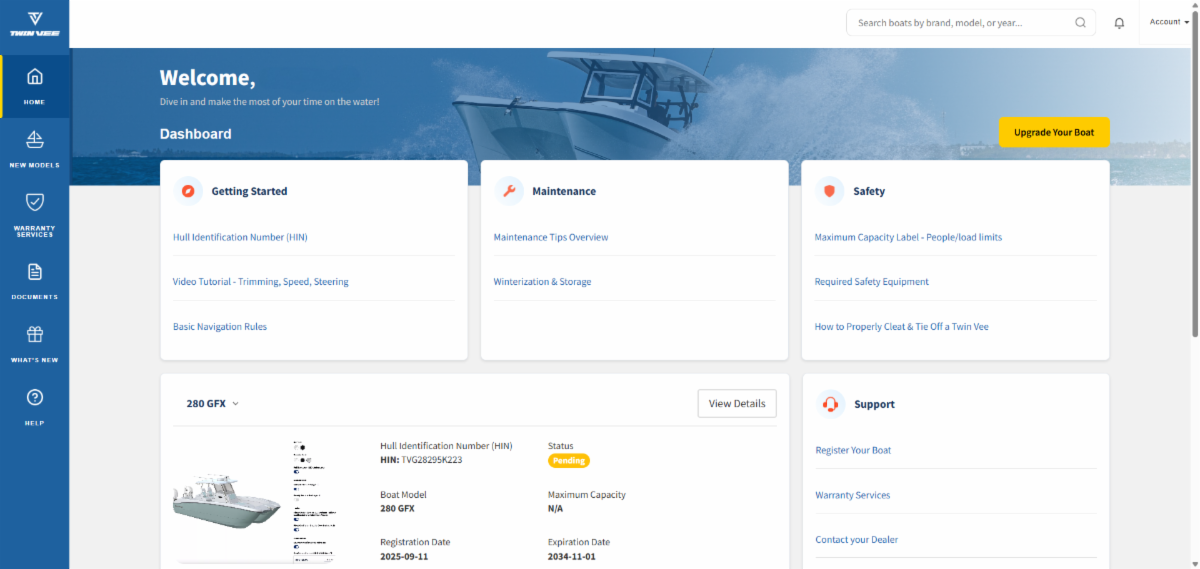 We’re excited to announce the launch of the Twin Vee Owner’s Portal, a secure online space designed exclusively for Twin Vee owners. This platform, built from the ground up, empowers boat owners with a comprehensive, centralized hub for managing their boat information and connecting with Twin Vee.