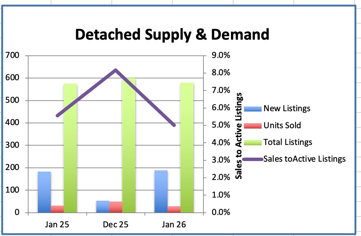 The total home supply in Metro Vancouver in 2025 is up 9.9% over January 2025 and that is 38% above the 10 year seasonal average while sales were down 28.7% from January 2025 and that is down 30.9% below the 10 year seasonal average.