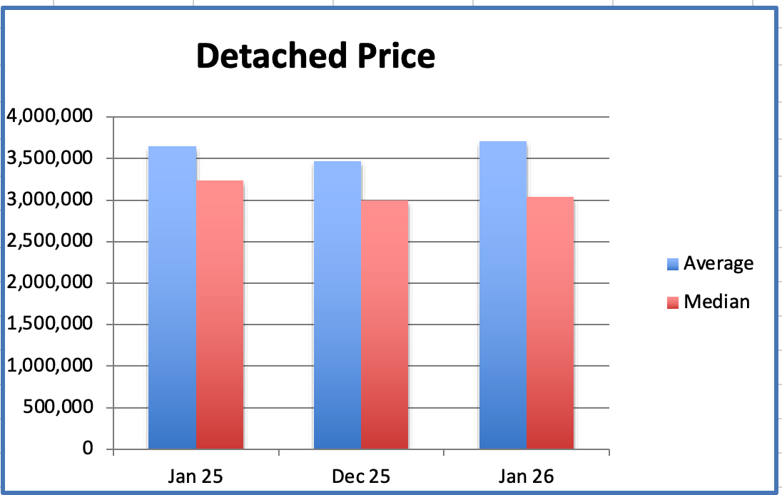 In January the Westside Detached Home average price was $3.709M, down 22% from $4.744M, the peak, in August 2023.