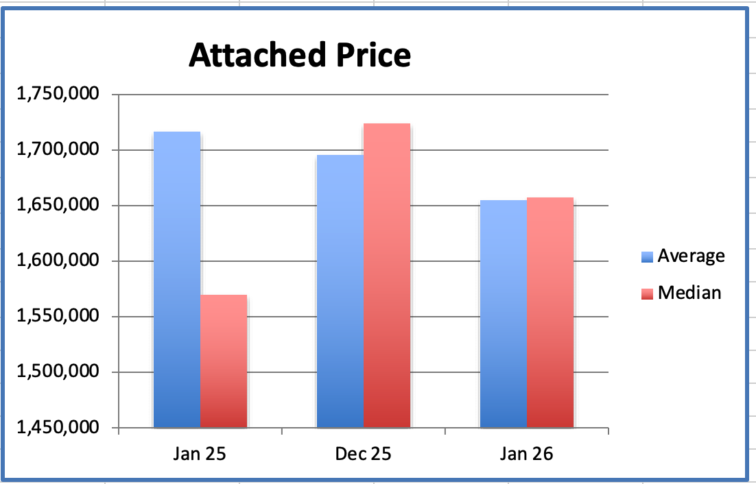 The Attached home average price was $1.655M, down 12% from $1.885M, the peak, in Dec 2024.