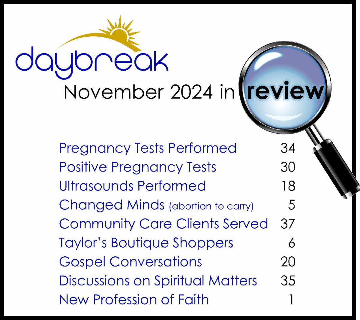 Would you consider including Daybreak in your year-end giving? Whether a one-time gift or becoming a monthly partner, you can be confident that your gift is having an impact. From pregnancy testing and ultrasounds to options consultations and Biblical counseling, to material assistance such as diapers, formula, wipes, car seats, clothing and more, or ongoing discipleship and parenting training – we stretch every dollar raised.