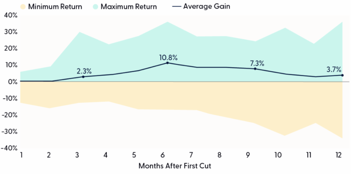 Disclosures: Any futures referenced are being presented as a proxy, not as a recommendation. Past performance is no guarantee of future results. Progression data based on first Fed rate cuts in 1974, 1980, 1981, 1984, 1989, 1995, 2001, 2007, 2019