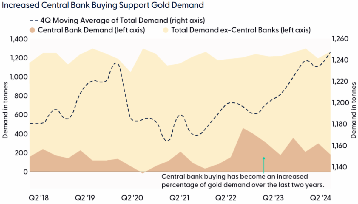 A weaker dollar and declining interest rates have played leading roles in gold’s rally to record highs. However, in recent years, central banks have increasingly played a supporting role. According to the World Gold Council, global central banks purchased record levels of gold in 2022, followed by near-record-level buying in 2023. More recently, global central banks bought 183 tonnes of gold in the second quarter, marking a 6% increase compared to last year. Rising demand has been driven by foreign central banks diversifying away from dollar reserves, partially due to worries about escalating U.S. deficits, and perhaps more significantly, concerns over the potential seizure of reserve assets by the U.S. government — as Russia witnessed after the 2022 invasion of Ukraine.