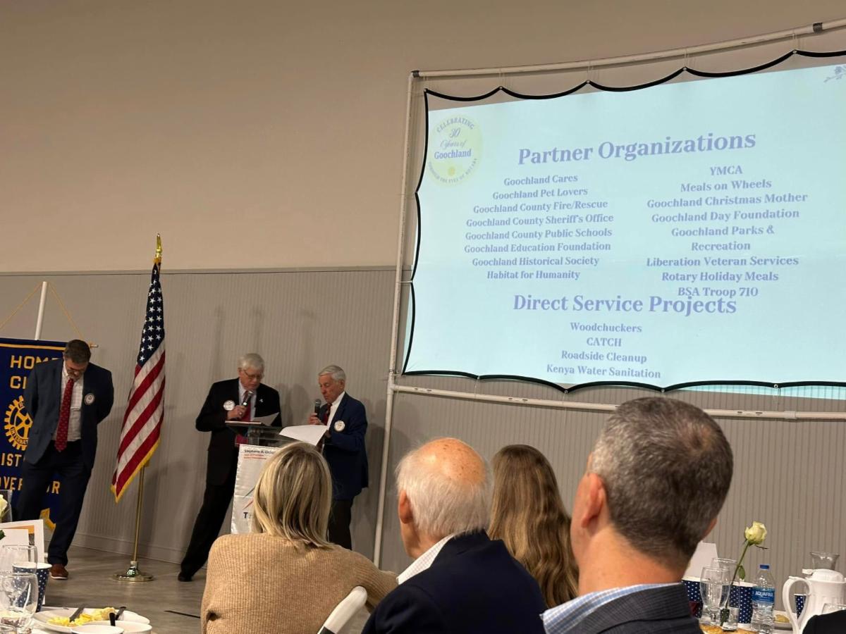 WHEREAS, Goochland Rotary grants and service projects range from roadside cleanup, Meals on Wheels, Goochland Cares, Goochland Habitat for Humanity, Goochland Education Foundation, Goochland CASA, Goochland Pet Lovers, the Goochland Historical Society, Goochland YMCA, Boy Scouts of America Troop 710, Liberation Veterans Services, Goochland Day Foundation and the Goochland Christmas Mother; and