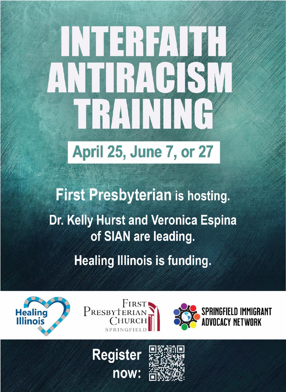 | | First Presbyterian Church is grateful to have received a Healing Illinois grant to offer antiracism training to faith communities across our diverse traditions. SIAN is partnering with us to offer this excellent training. Each training requires a six hour commitment. We will provide nourishment for hearts, minds, and bodies. More details will be sent to registrants. | |