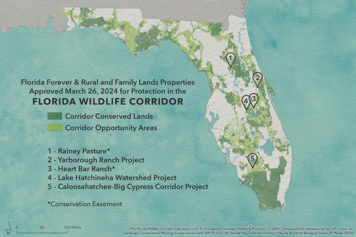 On March 26, the State of Florida approved funding for the permanent conservation of 36,091 acres across five properties within the Florida Wildlife Corridor. Thank you to the leadership of the landowners, the Florida Department of Agriculture and Consumer Services, the Florida Department of Environmental Protection, The Nature Conservancy, Keith Fountain Law, Saunders Real Estate, Axel Real Estate, and other partners for coming together to make these opportunities possible.