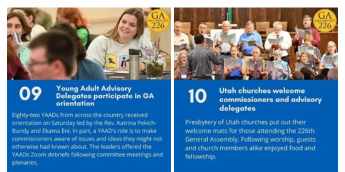 Thanks to the folks from the Presbytery of Great Rivers who attended the 226th General Assembly that was held last week in Salt Lake City, Utah and served with energy, intelligence, imagination, and love. Ruling Elder Commissioners Fiona McGrath Nagle and Carol Sleeth, Teaching Elder Commissioners Lonna Lee and Frosty Krummel, and Young Adult Advisory Delegate (YAAD) Evan Lyon participated in online training and committee work prior to the Assembly and then represented Great Rivers faithfully during the 5-day marathon that is GA. At our August 24 Presbytery Assembly, they will talk about the actions taken and the subsequent votes that will come before each Presbytery in the coming months.