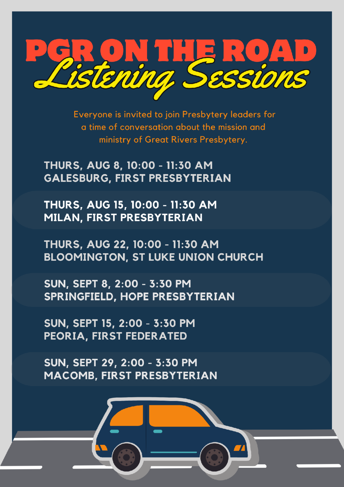 The Leadership Team and Governance Task Force continue to look at the work and structure of the presbytery. Now they want your feedback! PGR on the Road: Listening Sessions will take place at six locations around Great Rivers during August and September. All are invited—pastors, ruling elders, church members who are not serving on sessions—everyone who wants healthy, vital, connected churches; a robust and responsive presbytery; and presbytery staff and leadership who are well-equipped to serve the present and future needs of PGR.
