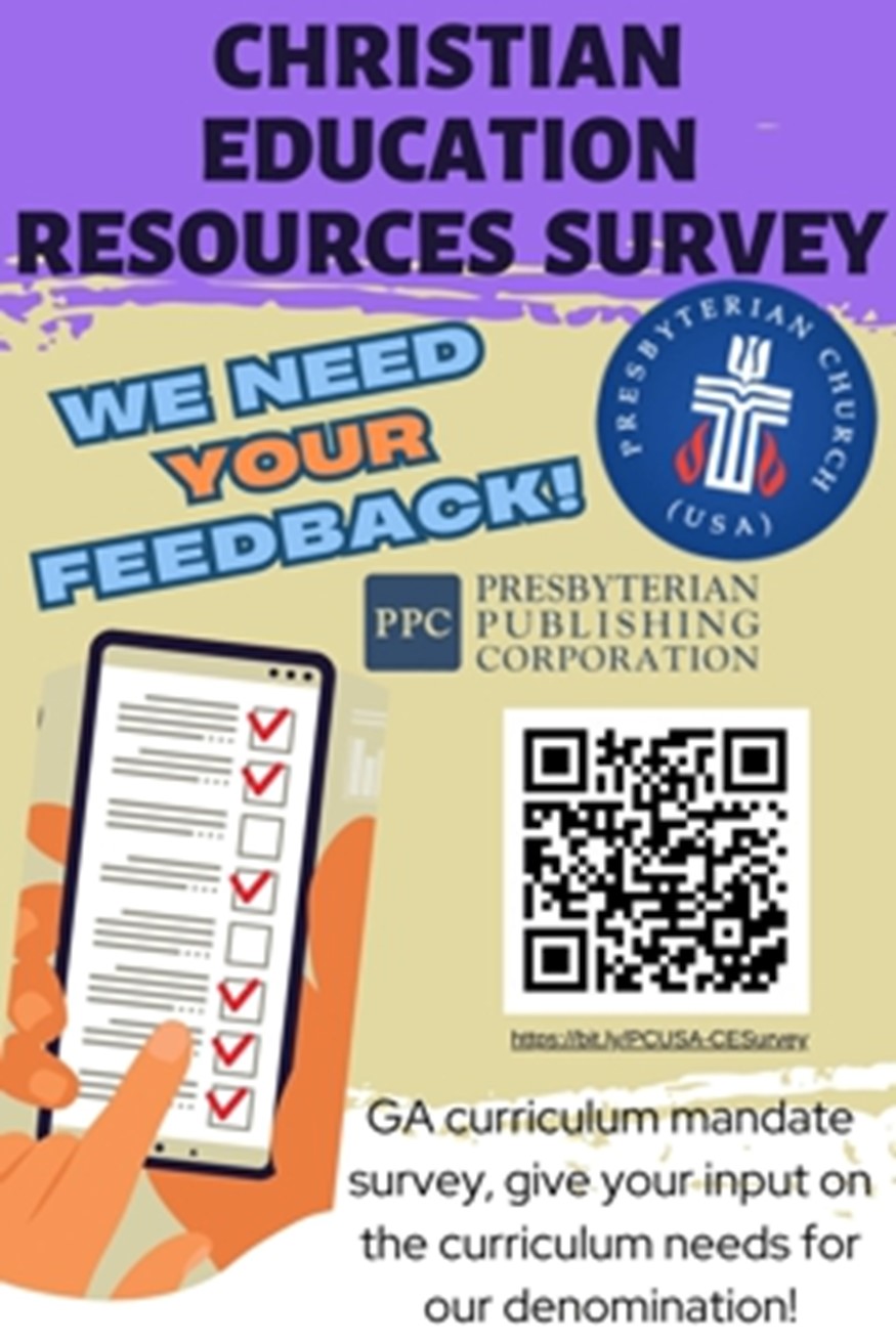 The 226th General Assembly (2024) directed the national office of Christian Formation and Presbyterian Publishing Corporation, in collaboration with Research Services, to determine the current Christian education practices and resource needs in order to respond to those needs. They are to return to the next General Assembly with a proposal. The following survey is one way we are gathering information. Your response is important. Please reply by the end of March.
