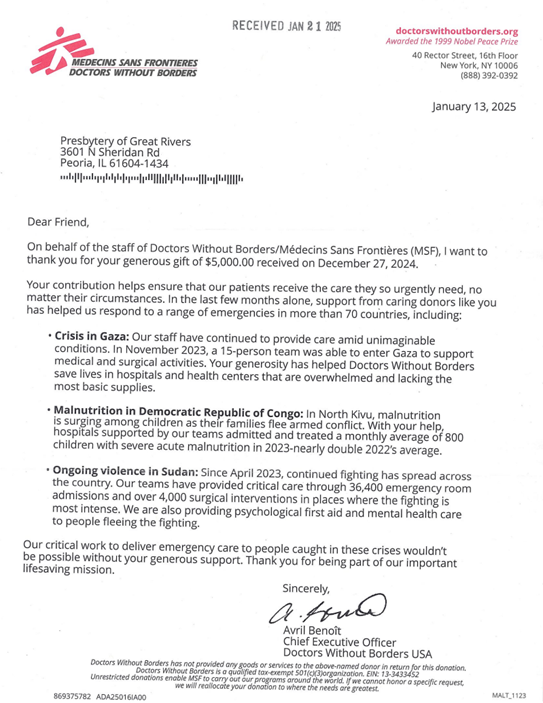 The first presbytery meeting of 2025 was held on February 11 on Zoom. Rev. Karol Schilling (Normal, First) led us in a time of evening prayer. Rev. Elissa Bailey, Stated Clerk, introduced the evening’s offering for Presbyterian Disaster Assistance with stories and photos of her experiences volunteering for PDA relief efforts.
