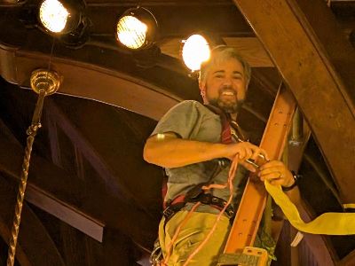 Who better to have a ladder long enough to reach our nave spotlights than a roofing company!? Our own Chas Sharp, a manager at Baker Roofing, not only secured a 40 ft ladder but donned his safety gear and took the climb to the buttress-mounted spotlights to refocus them. Chas was joined by his coworker, Matt Green. We so appreciate these gentlemen resolving a problem that had been persisting for years. Thank you, Chas and Matt! | | |