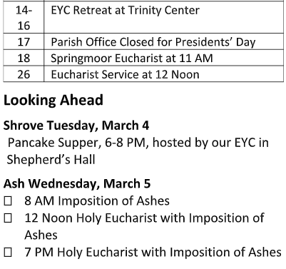 - Feb. 14-16 - EYC Retreat at the Trinity Center