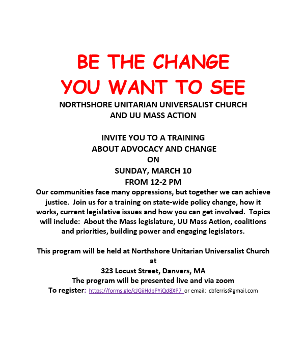 Join UU Mass Action for our annual Virtual UU Advocacy Day to live out our values by taking action together on Tues, March 26th. At this annual event, we come together as UUs from across the state to build power for our movements. Participants will meet with legislators about our key areas of Immigrant Justice, Climate & Environmental Justice, Economic & Housing Justice, Indigenous Justice and Decarceration & Ending Solitary Confinement. As we near the end of the 2023-34 legislative session, this will be a critical moment to show up together as UUs, grounded in our faith, to let our legislators know which bills - out of the thousands that are filed - we care the most about.