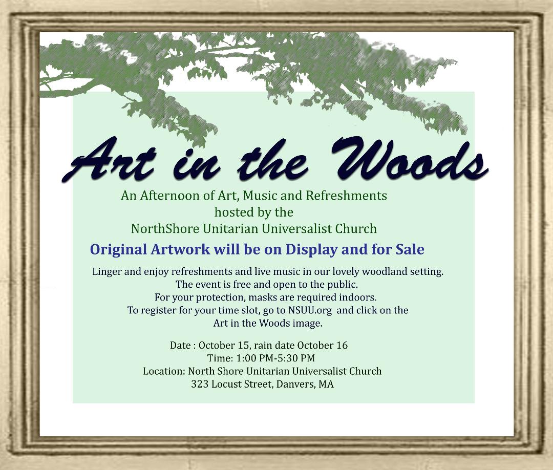 Many thanks to the people who have signed up to volunteer at the Art in the Woods Fundraiser. The Fundraiser is just 2 weeks away. We must get out the publicity by sharing the flyer and cards with friends, family, businesses and anyone you know. The flyer is on the NSUU Facebook Page and on the NSUU website and flyers and cards are available on the Welcome Table in the church Fellowship Hall.