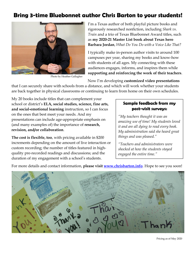 for the 2020-21 school year. I typically make in-person visits to around 100 campuses per year, sharing my books and know-how with students of all ages. My connecting with these audiences engages, informs, and inspires them while supporting and reinforcing the work of their teachers.