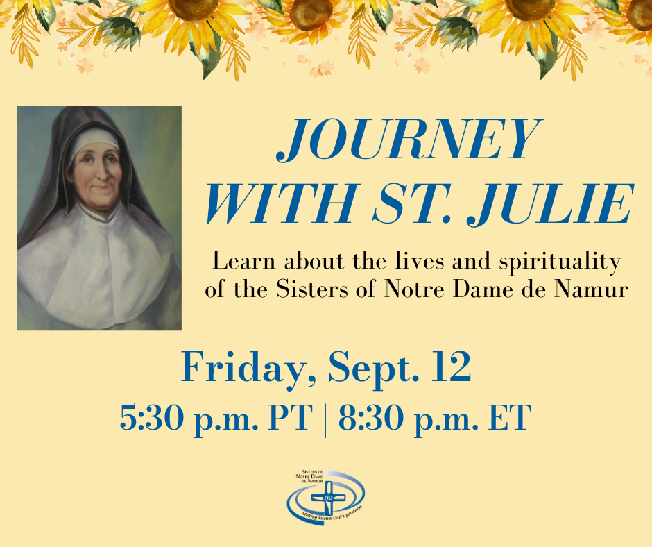 On the 12th of each month, “Journey with St. Julie” will include prayer, aspects of St. Julie’s story and faith sharing questions. The first meeting is Friday, September 12, with Sister Jo-Ann Flora, SNDdeN as the featured guest speaker. All are welcome!