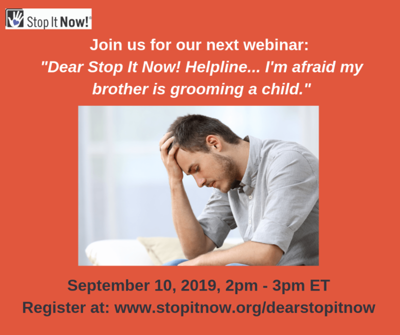 "Dear Stop It Now! Helpline...I’m afraid my brother is grooming a child." This webinar will share letters from Helpline inquiries about loving someone who is demonstrating at risk warning signs and need next steps. Tuesday, September 10