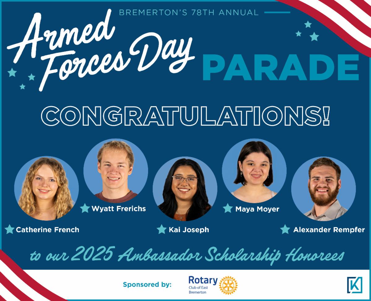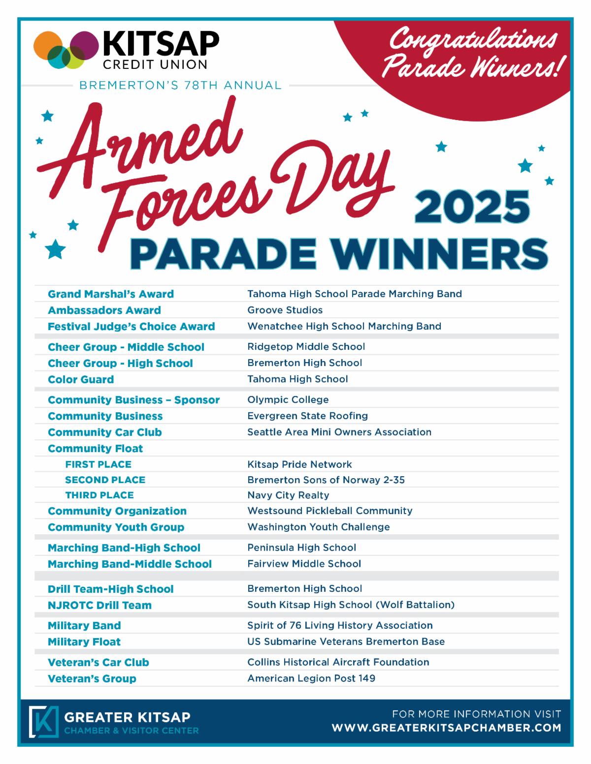 | | This year's Armed Forces Day Parade Ambassador Scholarships were sponsored by the Rotary Club of East Bremerton. Students were selected by a committee from the Rotary based on their application, academic profile, letters of recommendation and personal essay. The five students representing the Bremerton, Central Kitsap and North Kitsap School Districts will be recognized at next week's Chamber Luncheon and a Rotary breakfast in early June. Congratulations to the recipients! | | Congratulations to 2025 Parade Winners | | RECAP: Peninsula Alliance Ribbon Cutting | | The Greater Kitsap Chamber was proud to join Peninsula Alliance on May 16th for a ribbon cutting in Downtown Bremerton for the Bill Mahan Apartments. The apartments meet a critical need in the greater Kitsap community for affordable housing with the additional feature of serving members of the intellectual and developmentally disabled community. Funded by an $8.9M one-time grant award from the Washington State Department of Health and Human Services (DSHS), a $1.05M grant from Kitsap County, as well as additional funds from the Washington State Department of Commerce and the Bremerton Housing Authority, the Bill Mahan Apartments will provide 22 units of housing for individuals struggling to afford housing on their own, individuals that are transitioning out of an institutional setting, and individuals that are homeless or at risk of becoming homeless, with the goal of providing safe and secure housing for this population. | | Vote Now: Board of Directors 2026 Slate | | |
