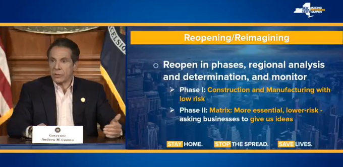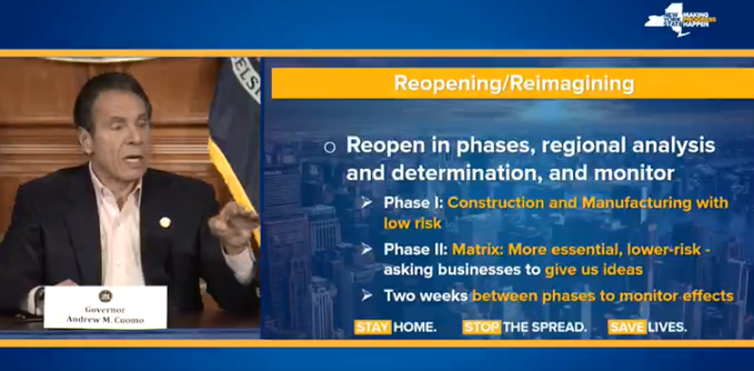 I’m pleased to say that yesterday, at his daily press briefing, the Governor took a step in our direction. He announced a two phase approach, re-opening plan, that would start with construction and manufacturing with time to measure any potential spread of COVID-19. If all goes well, step two would commence with more measuring for the virus.
