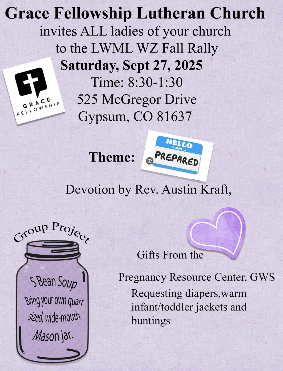 Pastor Austin Kraft, 970-688-1100, austin@gracegypsum.com