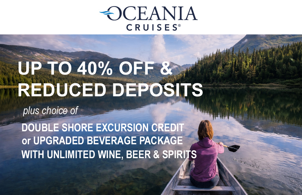 | | | *Offers and fares are subject to change or withdrawal without prior notice. Advertised fares may fluctuate and are subject to change. Upgrade Your Experience sale is valid through March 4, 2026. Choice of Double Shore Excursion Credits or Unlimited Wine, Beer & Spirits plus Up to 40% Off and 50% Reduced Deposits are available for select categories on select sailings, subject to change and capacity controlled. Unlimited Wine, Beer & Spirits is valued at $89.95 per person per day. Unlimited Wine, Beer & Spirits includes a selection of wine by the glass, beer, spirits and cocktails from our General Bar & Martini Bar Menu, available at any on board venue as well as through room service during operating bar hours. Certain exclusions apply. Mention Code WV2. For Your World Included amenities, guests in the same stateroom must choose the same amenity. Choice of amenity must be made by final payment and is not applicable to 3rd and 4th guests. Amenity choices are (1) Complimentary Wine & Beer or (2) Shore Excursion Credit. If no amenity is chosen, a non-use credit will be applied to final payment: for sailings up to 9 days receive US$200 credit per stateroom; 10-13 days receive US$300 credit per stateroom; 14-19 days receive US$400 credit per stateroom; 20-25 days receive US$500 credit per stateroom; 26+ days receive US$600 credit per stateroom. Complimentary Wine & Beer includes a selection of wine by the glass or beer from our General Bar Menu, available at any onboard venue as well as through room service during operating lunch and dinner hours. Certain exclusions apply. If Shore Excursion Credit is selected, it is recommended to secure all shore excursions at least 14 days prior to sailing. Value of shore excursion credits varies by voyage length and is per stateroom except for a single traveler booked in a Solo category or booked with a single supplement discount, where amenity is per guest. Voyages (1) up to 9 days receive shore excursion credit of US $400; (2) from 10-13 days receive US $600; (3) from 14-19 days receive US $800; (4) from 20-25 days receive US $1,000; and (5) greater than 26 days receive US $1,200. Any unused shore excursion credit can be used as shipboard credit on the same voyage or will be surrendered upon debarkation. 50% Reduced Deposits applies for new bookings only and only if cruise departure date is outside of final payment deadline. This Offer is not valid on Around the World Cruises and segments. Certain exclusions apply. For more details about Best Value Guarantee, visit OceaniaCruises.com/legal. All fares are per person based on double occupancy, valid for residents of United States and Canada – for new bookings only and may be withdrawn at any time. Unlimited WiFi amenity does not include streaming and includes a login for the first two devices per stateroom (one login for solo traveler). Visit OceaniaCruises.com/internet for more details. Fares are based on published Full/Brochure Fares; such fares do not include optional charges as detailed in the Guest Ticket Contract, which may be viewed, along with additional terms, at www.OceaniaCruises.com. All cruise fares include gratuities for stateroom/suite attendants, butlers and dining waitstaff, as well as government taxes and fees. For other services or purchases made onboard, additional gratuities of 20% apply. Not all promotions are combinable. We may collect, use, share and secure your personal data as described in our privacy policy, which is available on our website at www.OceaniaCruises.com/legal/privacy-policy. Oceania Cruises reserves the right to correct errors or omissions and to change any and all fares, fees, promotions and surcharges at any time. Ships’ Registry: Marshall Islands. | | |