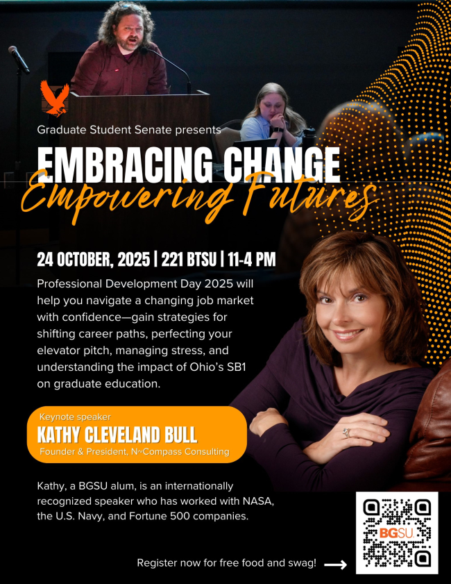 | | | | *To individuals with disabilities, please indicate if you need special services, assistance or appropriate modifications to fully participate in this event by contacting Accessibility Services, access@bgsu.edu, 419-372-8495. Please notify us prior to any event. | | The Graduate College Weekly Update is published every week by the Graduate College during the Fall and Spring semester. Submit events and announcements to gradcol@bgsu.edu. Submissions are due Wednesday at 5:00pm the week before the event. | | | | |