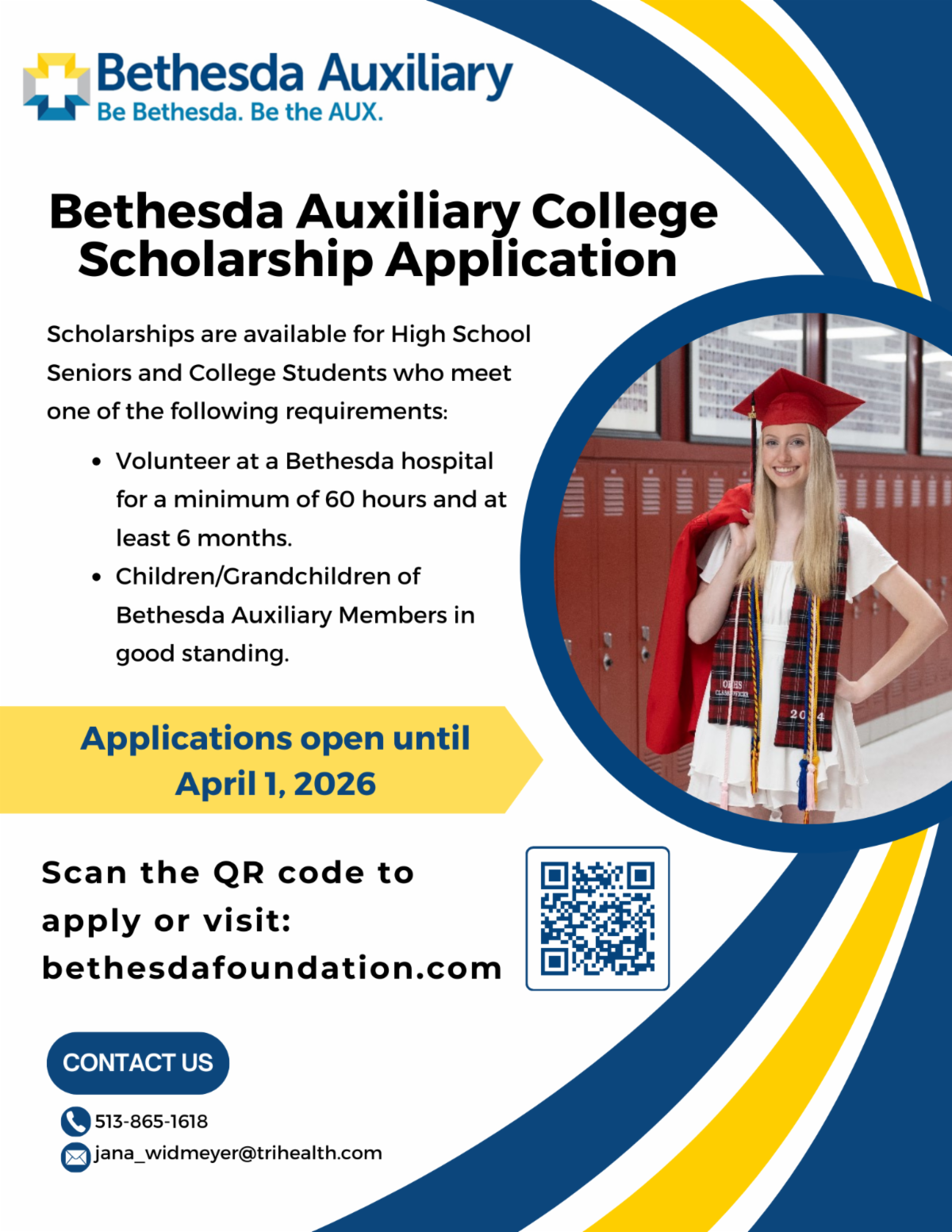 Applications are now open for FY27 Project Grant Funding and College Scholarships for hospital volunteers and family of Auxiliary members. Scan the QR code or click the button below to apply! Deadline is April 1.